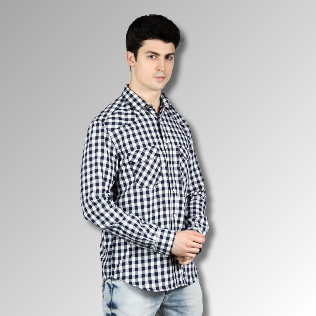 Look your best in this stylish and comfortable Navy Men's Western Shirt in Cotton Checks . Made of 100% cotton yarn-dyed checks, this full-sleeved Cowboy's Shirt features double flap pockets, contrast color out stitching for special detailing, and contrasting snap buttons. Stand out from the crowd and express your unique style - why not add this shirt to your wardrobe today?